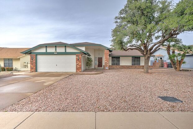 Fully remodeled rental home featuring an open floor plan that offers seamless flow for everyday living and entertaining. The eat-in kitchen includes a breakfast bar and stainless-steel appliances, opening to a spacious great room with a cozy fireplace and French doors that lead to a beautiful desert patio.