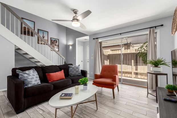 Attractive 2 bed, 1.5 bath townhouse in amazing Scottsdale location! Downstairs enjoys large living room, galley style kitchen with white cabinets and butcher block tops, half bath, dining area and laundry room. Kitchen looks out into living room for that great room feel. Upstairs has two bedrooms with vaulted ceilings and shared bath. Bath has been updated with an attractive vanity and subway tile shower surround. Main bedroom has walk-in closet. Covered patio right of dining area and private fenced yard off living room. Unit comes with 1 assigned covered parking space. Located right in between Old Town Scottsdale and Tempe Rio Salado District; this area is close to shopping & night life. Unit can be rented furnished or unfurnished.