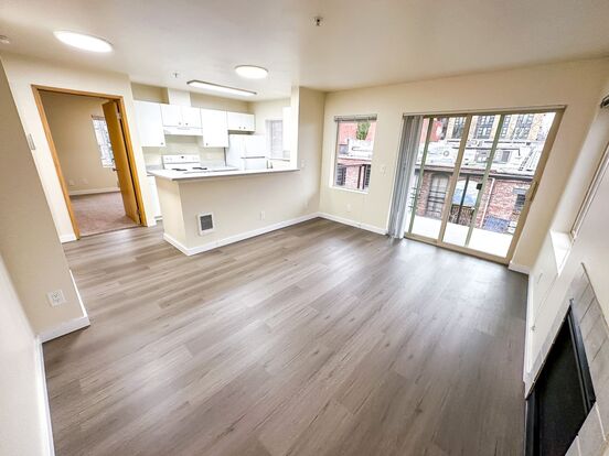 Harvard Vista #204 is a stunning corner unit apartment located in the heart Capitol Hill, just one block from Broadway and E John St. This spacious 1-bed, 1-bath offers a modern and comfortable living experience. As you step inside, you'll be greeted by beautiful laminate wood flooring and large living room area with ample space for relaxation and entertainment. On chilly evenings, cozy up by the gas fireplace and enjoy its warm ambiance. Step out onto your private balcony and take in views of the city. This apartment features a fully equipped kitchen with a microwave, dishwasher, and a convenient breakfast bar for quick meal prep and additional seating. The convenience of having a washer/dryer in-unit cannot be overstated! Say goodbye to laundromats and enjoy the ease of doing laundry in the comfort of your own home. We also have an elevator, as well as 2 garages with reserved parking for tenants (subject to availability), so you won't need to worry about finding a spot on the street.