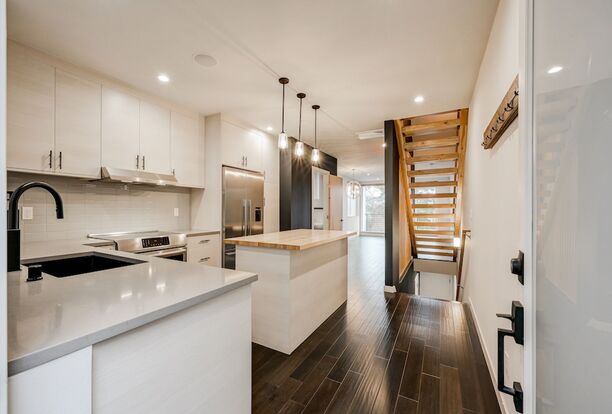 Main floor features an open living area and kitchen that includes modern finishes throughout such as stainless steel appliances, hardwood floors, and induction stovetop.