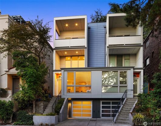 Upstairs, you’ll find three generously sized bedrooms, including a full-floor primary suite with a spa-style bathroom, walk-in closet, and a covered deck. The rooftop deck offers sweeping views of the city, mountains, and lake. Additional amenities include a one-car attached garage and air conditioning. Just steps away from neighborhood cafés, restaurants, transit options, and the beauty of Volunteer Park.