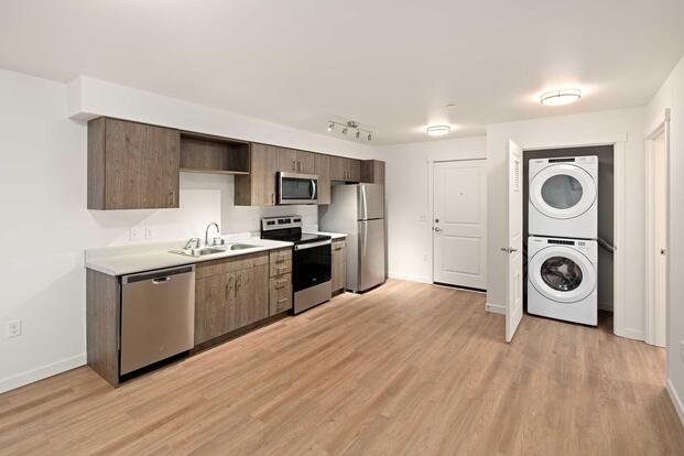 At Polaris at Lake City we offer studio, one, two, and three-bedroom apartments for rent designed with a seamless fusion of chic design and cozy living. Cook effortlessly in a modern kitchen outfitted with stainless steel appliances. Each home has a full-size washer and dryer, carpeted bedrooms with large closets, and luxury vinyl plank flooring.