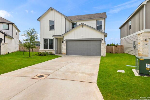 Bright, functional, and full of charm-this two-story home offers the space and style today's renters are seeking. Ideally situated between New Braunfels and Seguin with quick access to Highway 46, the location provides small-town living with big-time convenience. Inside, the open layout seamlessly connects the spacious living room, dining area, and kitchen, creating a natural gathering space for friends and family. A downstairs bedroom with a walk-in closet offers flexible options for guests, an office, or a hobby room. The kitchen is sure to impress with granite countertops, white cabinetry, a center island, and stainless-steel appliances. Upstairs, a generous loft makes the perfect second living area or playroom. The grand primary suite offers room to unwind, featuring an expansive en-suite bathroom with dual sinks, a walk-in shower, and a large walk-in closet. Two additional bedrooms and a full bath round out the second level. Step out back to a covered patio overlooking a grassy backyard-ideal for outdoor dining, play, or relaxing in the shade. Be sure to view the full list of upgrades for more thoughtful touches that make this home a standout.