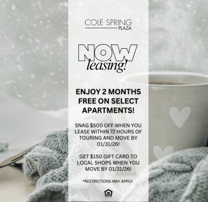 Now Leasing: Enjoy TWO MONTHS FREE towards select apartments! Apply within 72 hours of touring and snag $500 off your rent! PLUS Get a $150 gift card to local shops! *Restrictions may apply. Must move by 01/31/2026.