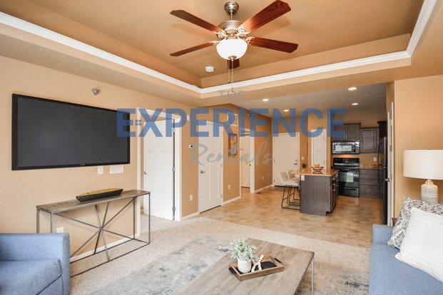 This unit features an open living concept with a large kitchen and living area with tray ceilings that lead to a walk-out balcony. It also has a separate laundry room with plenty of extra space.