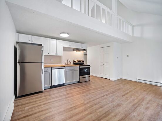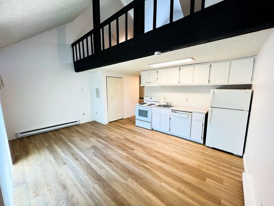 LOFT STYLE SOUTH HILL 1 BEDROOM NEAR FERRIS H.S - Cozy, loft-style one bedroom located on Spokane's South Hill near Ferris HS. Open floor plan, with lots of light. Recently updated with shaker-style cabinets, custom butcher-block counter tops, stainless appliances, and handsome LVP flooring. Private fenced patio, A/C, D/W, off-street parking, and on-site laundry.