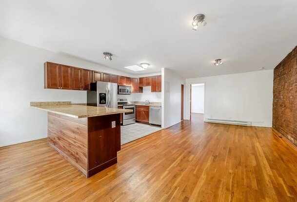 Experience unmatched comfortable living in this expansive 1-bedroom apartment, boasting a spacious layout throughout. Delight in the apartment's unique features, such as exposed brick and decorative fireplaces in both the living room and bedroom, and bask in the abundance of natural light pouring in from the southern exposure and the skylight window. The upgraded kitchen showcases a massive island doubling as a breakfast bar, lots of cabinet storage, stainless steel appliances, a microwave and a dishwasher.
