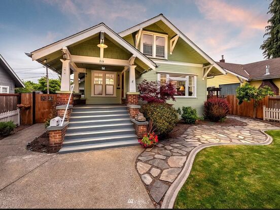 This charming Craftsman style 3 bedroom, 1 bathroom, 1472 square foot home is located in Sumner, Washington. The 1920s home nestled in a historic neighborhood has been updated with all of today's modern conveniences on the inside and out. It comes complete with a white picket fence, mature garden, and a quaint covered front porch. You walk into a bright welcoming living room with a gas fireplace. The elegant kitchen comes with stainless steel appliances and remote controlled LED countertop and cabinet lighting. The primary bedroom has a large walk-in closet. In-unit laundry is located in the basement.