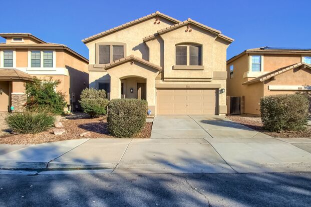 This beautiful 3 bed 3 bath home is located in Sun City. Spacious living room with laminate flooring upon entry to the home. Open kitchen and dining space just off the living room. Kitchen has stainless steel appliances, quartz countertops, and plenty of cabinet space. Spacious laundry room just off the kitchen. Head upstairs to find all three bedrooms with hardwood floors and bonus living space. Primary bedroom has mountain views, an en-suite bathroom with two sinks and a walk-in closet. Both additional bedrooms have walk-in closets as well. Additional full bathroom upstairs. Backyard with high walls, a covered patio space to relax and natural grass lawn. The home also utilizes a cost effective solar power plant. Large HOA Park with a tennis court, basketball court, and beach volleyball court! New AC Units, Water Heater and Water Softener installed this year!!