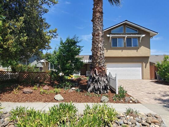 Spacious single family home located between Apple and Kaiser with 4 bedrooms, 2.5 bathrooms, and a 2 car garage. The home features fresh paint, refinished wood floors, central air conditioning. The kitchen includes a smooth counters with wood cabinets, built in oven and stovetop, dishwasher, fridge, and microwave. Large master bedroom with retreat, vaulted ceilings, large windows, and remodeled bathroom. The front yard underwent a dramatic renovation with a paver driveway, front patio, and wood deck with railing. Cute backyard with stone patio and artificial grass.