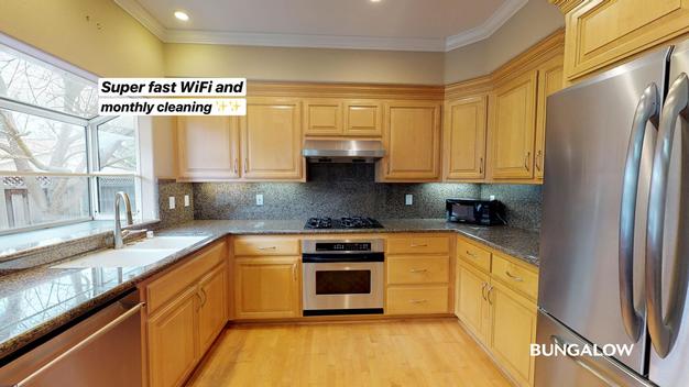 This home features furnished common spaces, in-unit laundry, A/C, and kitchen essentials including a dishwasher. It also provides high-speed WiFi and monthly professional cleaning services. Parking is available on a first come, first served basis.