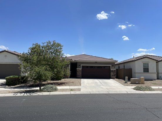 Welcome to Sycamore Farms! This rental home boasts tons of upgrades! Walk into modern tile floors, custom paint and a wide-open floor plan! Kitchen with walk-in pantry, large center island with drop pendant lighting, granite counters, custom backsplash, white cabinets and lots of designer touches! Stunning master suite with oversized walk-in closet and bath with dual vanities. 2nd bedroom is good sized with ample closet space. Hallway has the perfect built-in desk to store papers and/or do homework! Den/office could also be a third bedroom if needed! Out back you will enjoy low maintenance landscape, covered patio extended with custom pavers. Community is close to shopping, dining and recreation including the Surprise Tennis & Racquet Center, Aquatic Center and
