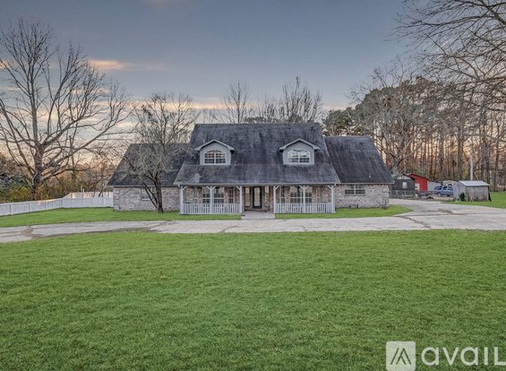 Spacious 5BR/3BA rental home in Texarkana featuring multiple living areas, fresh neutral finishes, and abundant natural light. The open-concept living room includes a brick fireplace and built-in shelving, flowing into a large kitchen with ample cabinet space and great layout for entertaining.