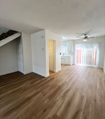 Spacious Living room with wood floors and fresh paint (throughout), a new newly installed ceiling fan with light fixture, coat closet, leading to an open dining room.