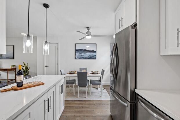 NEWLY Remolded — Brand New Remodeled 1BD 1BA W/ AC and W/D in Unit! - NEWLY Remolded — New Remodeled 1BD 1BA W/ Patios/ Balconies, apartments with: Shaker white cabinets in the kitchen and bathrooms, white quartz counters, tile floors in the bathroom, stylish wood laminate floors in the living room, kitchen & bedrooms, SOAKING (DEEP) tub, STAINLESS STEEL APPLIANCES (dishwasher, range, microwave & refrigerator), WASHER and DRYER & AC in unit, fixtures and SMOOTH CEILINGS throughout!