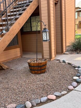 This charming, three bedroom two bath is just waiting for you! Wood laminate flooring throughout. Living room with fireplace. Kitchen comes complete with stove, dishwasher and refrigerator. There is a countertop microwave along the buffet sideboard. The guest bathroom has a tub shower combo and the master bath has a walk-in shower. 3res bedroom/den does not have a closet. Stacked washer and dryer are in the hall hideaway! The back patio is perfect for relaxing as it will stay shaded most of the day.