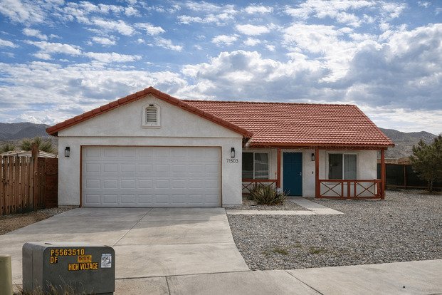 Additional features include an indoor laundry area with washer and dryer hookups, neutral interior paint, window blinds, modern lighting fixtures, and an attached garage. The home is situated on a quiet residential street with easy access to the Marine base, schools, shopping, and Joshua Tree National Park.