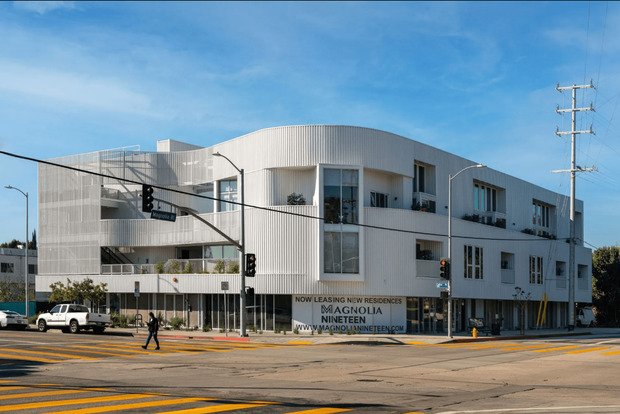 Centered around a light-filled courtyard, 11700 Magnolia is interconnected by a series of landscaped pathways that lead to a rooftop Zen garden. Each home enjoys ample daylight, natural ventilation, and private open spaces with sweeping views of the Santa Monica Mountains and the surrounding natural landscape, including century-old oak and cedar trees. The thoughtful arrangement of exterior screens and panels that wrap the building with engaging curvature presents a constantly changing exterior visual by playing off the natural reflection and glow of sunlight.