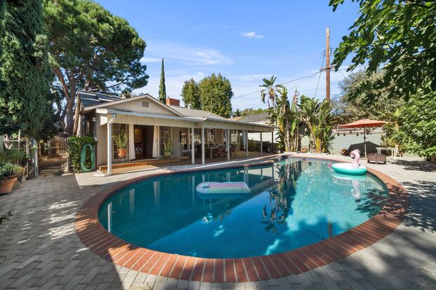 Nestled in the heart of the San Fernando Valley on a serene cul-de-sac, this iconic Birdhouse Ranch Mellenthin home embodies the luxurious charm of the iconic builders postwar homes. Be the first to rent this thoughtfully updated oasis featuring a gourmet kitchen, elegant hardwood floors, and a stunning double-sided fireplace. The spacious living and formal dining areas create an inviting atmosphere, while the full laundry room adds convenience. The primary suite opens through French doors to a lush backyard and has easy access to the remodeled hallway bath. The secondary bedroom offers ample light and closet space, while the third bedroom is well appointed with a fireplace, private bathroom, and an attached den area. Outside, a beautifully hardscaped yard awaits with a paver-lined pool, BBQ, and dining space. Solar panels ensure energy savings, and pets are welcome. All furniture pictured can be removed or it can stay in the home. Experience sophisticated Valley living in this exceptional architectural gem.
