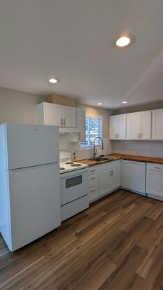 Great natural light and open floor plan. New laminate wood floors, carpets and blinds throughout. The modern kitchen and living room provides ample opportunity for entertaining. The kitchen features white shaker cabinets, with soft close drawers and doors and butcher block countertops, gorgeous white subway tile backsplash, and on trend white appliances.