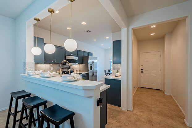 Now Available for rent! Two bedroom and two bath, single story in Beautiful Active Adult community of Sun City Festival. The home is bright and open with a wonderful great room just off the kitchen. The kitchen has stunning navy cabinetry, quartz counters, stainless steel appliances, breakfast bar seating and nook. The home has beautiful tile flooring and carpeting in all the right places. Primary suite offers a large Walk-in closet, ¾ ensuite with dual vanity & walk-in shower. It is a beautiful home that is sparkling clean. The low maintenance desert landscaping. Also, as a bonus, it has solar so the electric bill will be very low! *No Smoking. A small/medium dog would be considered. No cats.*