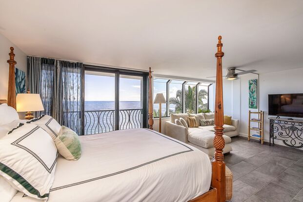 Beachfront furnished and fully renovated kitchen, bathrooms, flooring, closet-systems, and more - 2 bedroom, 2 bathrooms, beachside bed area opens up to the living and dining areas, one covered parking stall #19, pool, spa, BBQ deck on quartzite off beach lawn, private beach access.