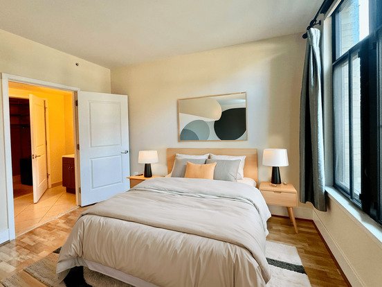 This gorgeous open 1 bed den has two full bathrooms, a walk in laundry storage room, floor to ceiling windows, stainless steel appliances, all wood floor and is across the street from the Metro entrance!