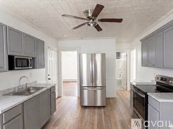 Step inside to find a bright and inviting layout complemented by richly refinished dark hardwood floors and a modern neutral color palette. The heart of the home is the updated kitchen, featuring sleek gray cabinetry, contemporary white walls, and a functional design perfect for home chefs. Each of the three bedrooms offers generous space and natural light, providing a quiet retreat for everyone.