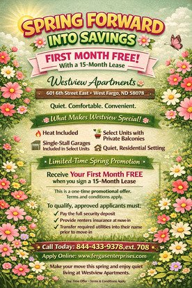 Lease today! - An Apartment building located in West Fargo, ND. Featuring 2 bedroom and 1 bedroom apartments that are well maintained and reasonably priced. Westview is located near schools, restaurants and multiple shopping destinations. Call now to see your next home! Call Joyce today, at 844-933-7487!