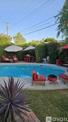 Resort-style backyard with a swimming pool and an oasis-inspired lounging area, perfect for relaxing