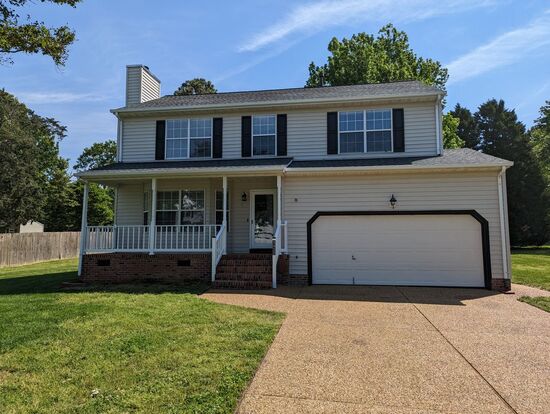 Say Hello to this lovely 2 story Colonial home located in Powhatan Crossing! Nestled within a cul-de-sac, this 3 bedroom, 2.5 bath home is a must see! Open great room with wood burning fireplace. The kitchen with center island and stainless appliances attaches to your half bath and laundry area. All bedrooms and 2 full bathrooms are located on 2nd floor. Enjoy these beautiful Spring days while relaxing on your covered front porch or back deck. Conveniently located to 199, shopping, entertainment and restaurants. Dogs are welcome but subject to owner approval with additional deposit and rent. No cats.
