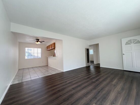 2 bed/1 bath single-story unit in Wilmington - Updated 2 bed/1 bath single-story unit located in Wilmington. Features include laminate flooring throughout, spacious living area and ceiling fans in all bedrooms. The kitchen features freshly painted white cabinets, new flooring and new stove. New interior paint throughout. Inside laundry hookups. Spacious private back yard and storage shed included. One assigned parking space included. Located close to shopping, restaurants and easy access to freeways. Do not miss out!